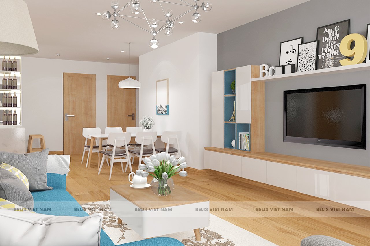 Điểm thu hút đầu tiên tại phòng khách gia đình anh Tuấn là bộ bàn ghế sofa kiểu dáng hiện đại, gam màu tươi sáng làm cả không gian nhà như bừng tỉnh. Với những căn hộ chung cư, các căn phòng đều trên một mặt diện tích nên để tạo độ thoáng thì giữa phòng khách và phòng ăn không có vách ngăn. Đồ nội thất trong nhà như bàn ghế phòng khách, bàn ghế ăn, giường ngủ đều được thiết kế theo phong cách hiện đại, kích thước gọn gàng nên không chiếm nhiều diện tích. Bên cạnh đó những bức tranh tường lớn như ở phòng ngủ làm cho tổng thể căn hộ tăng thêm tính thẩm mỹ và tạo dấu ấn riêng cho mỗi không gian.